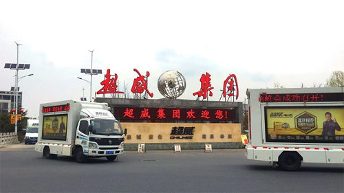超威E車全國宣傳推廣活動已堅持了多年,每輛車都整體配備三塊超清顯示屏,可以播放任何形式的視頻廣告、廣告字幕以及展示兩塊不同樣的噴繪廣告。因全新的模式、流動的畫面、大場面、高頻次的特點,可以給人以強列的震撼,收到聯營商的極大支持。