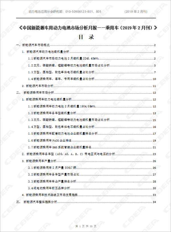 《2019中國(guó)新能源車用動(dòng)力電池市場(chǎng)分析月報(bào)——乘用車(2月刊)》目錄